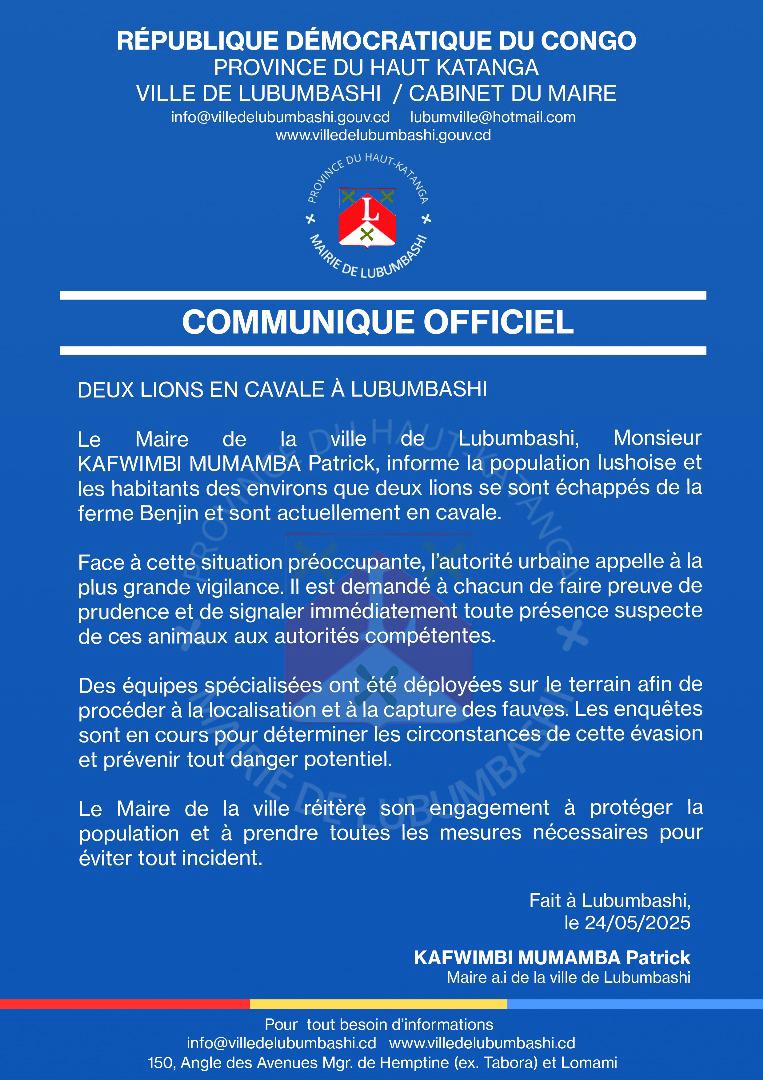 #COMMUNIQUE | Deux lions en cavale à Lubumbashi, Patrick Kafwimbi appelle à la plus grande vigilance.